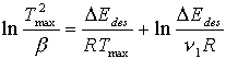 Nach Einführung der Heizrate und unter Ausnutzung der Tatsache, daß die Desorptionsrate sich bei der Peakmaximumstemperatur Tmax nicht ändert, kommt man nach einigen Umrechnungen zu: