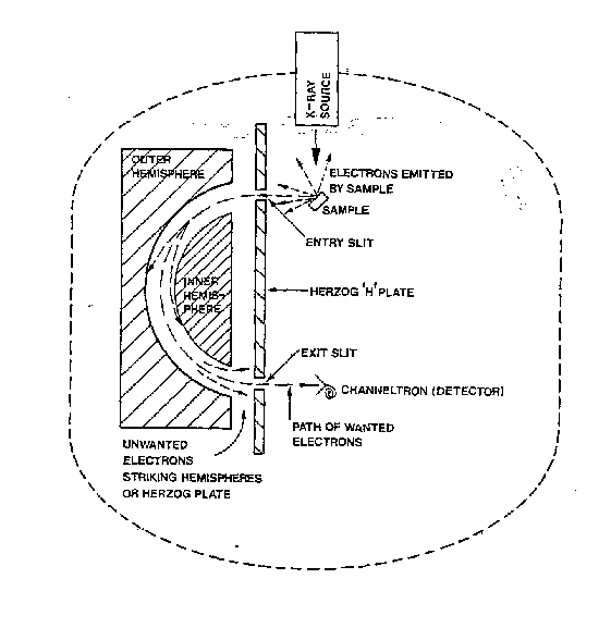 Charakteristisches Merkmal der Augerelektronen und damit auch der emittierenden Atomart ist deren Energie. In einem Elektronenspektrometer, hier ein CHA (concentric hemisphere analyser) gelangen die Elektronen auf Grund ihrer kinetischen Energie durch ein Linsensystem zwischen zwei Halbschalen (Hemisphären), zwischen denen sich ein elektrisches Feld befindet. Durch dieses Feld werden die Elektronen so in ihrer Bewegung beeinflußt, daß nur solche mit einer bestimmten Energie den nachge-schalteten Elektronenvervielfacher erreichen. Der CHA ist durch seine beiden Hemi-sphären doppelt fokussierend [ERT74].