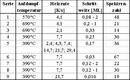 Die lineare Heizrampe sowie die Aufdampftemperatur wurden ebenfalls mit dem Rechner gesteuert. Die am meisten verwendete Heizrate war 7,7K/s, ein Wert, der ein Optimum in bezug auf die Auflösung und Intensität (bzw. Intensität-Rausch-Verhältnis) darstellt. Der gesamte verwendete Heizratenbereich erstreckte sich von 2 bis 30K/s.