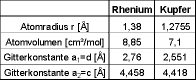 Kupfer kristallisiert in der kubisch-dichtesten Kugelpackung (fcc), Rhenium hingegen in der hexagonal-dichtesten Kugelpackung (hcp). Tabelle 2 [WEA74] enthält die kristallographischen Parameter.