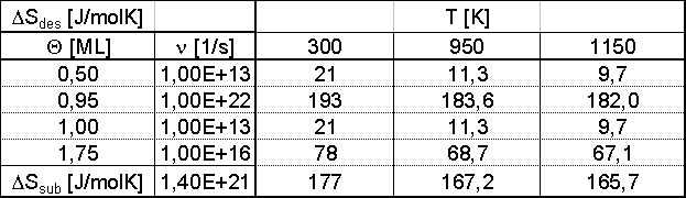 Der Verlauf der Desorptionsentropiekurve bei einer vorgegebenen Temperatur ist also bis auf einen Faktor derselbe wie der von lgn. Im Bereich bis etwa 0.2ML steigt DSdes bis auf einen konstanten Wert von etwa 10,5J/(molK) an. Im ersten Bereich sind die Teilchen noch sehr beweglich, d.h. sehr ungeordnet. Der Entropiegewinn beim Übergang ins 3D-Gas ist nicht sehr groß. Im Bereich der Koexistenz 2D-Gas/Kon-densat muß der Übergang vom Kondensat ins 2D-Gas berücksichtigt werden. Dabei bleibt die Desorptionsentropie konstant auf einem mittleren Wert. (Kurz vor dem Abschluß der ersten Lage wird sie sehr groß, da der Ordnungszustand der jetzt vollständig kondensierten und lokalisierten Phase maximal ist.) Die einzelnen Werte der Desorptionsentropie bei Raumtemperatur (hier ist zur Umrechnung ein konstanter Verlauf der Molwärme mit der Temperatur approximiert worden) und bei den Temperaturen zu Beginn und zum Ende der Desorption sind in Tab. 5 gegeben.