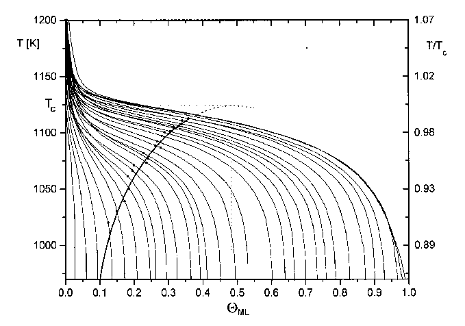 Aus Abb.50 wurden folgende Werte entnommen: Tc=1120K, Qc=0,48ML. Als Literaturwerte wurden für das System Cu/W(110) Tc=1150K und Qc=0,215ML [BAU85] sowie für das System Cu/Mo(110) Tc=1148K [BAU87] gefunden. Diese Punkte liegen weit außerhalb der Koexistenzregion aus Abb.50. In den von Bauer betrachteten Systemen ist diese Koexistenzregion also größer. Das ist auch verständlich, da dort, wie schon unter 1.4.6.a ausgeführt, die Wechselwirkungen stärker sind und sich in einem größeren Bereich des Phasendiagramms eine Region ausbilden kann, die z.T. aus kondensierten Teilchen besteht.