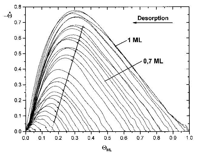 Die Spektren der kleinsten Anfangsbedeckungen (Q0<0.1ML) besitzen, wie schon oben ausgeführt, keine gemeinsame Flanke. Das bedeutet, daß bis zu dieser Bedeckung nicht von einer Bedeckungsgradunabhängigkeit der Desorptionsrate ausgegangen werden kann.