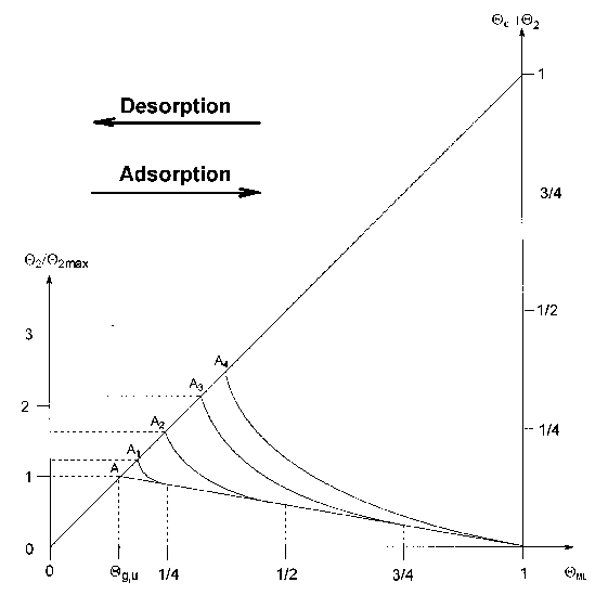 In Abb.52 sind die beiden Prozesse dargestellt, nämlich die isotherme Adsorption von links nach rechts und die Desorption von rechts nach links. Als Abszisse ist die Gesamtbedeckung gewählt. Auf der linken Achse ist die (auf die Maximalbedeckung bei Adsorptionstemperatur) normierte Bedeckung mit 2D-Gasteilchen abgetragen, die rechte Achse gibt die Summe der Bedeckung mit 2D-Gasteilchen und kondensierten Teilchen an.